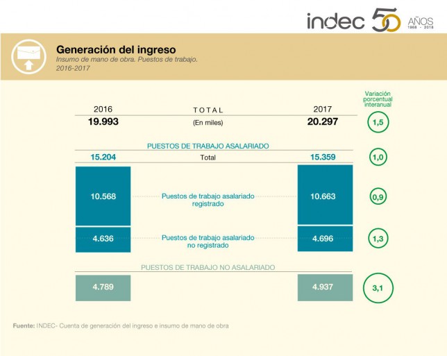 En concreto, los puestos de trabajo asalariado registrados crecieron 0,9% interanual, y los no registrados, 1,3%.Entre ambos pasaron de 19.993.000 en 2016 a 20.297.000 en 2017.