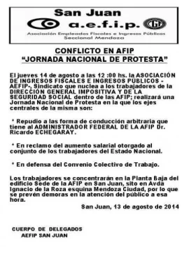 San Juan, 14 de agosto.- Los trabajadores de AFIP realizaron este mediodía una medida de fuerza para pedir por una recomposición salarial para el sector y repudiar la conducción del Administrador de la entidad, Ricardo Echegaray.