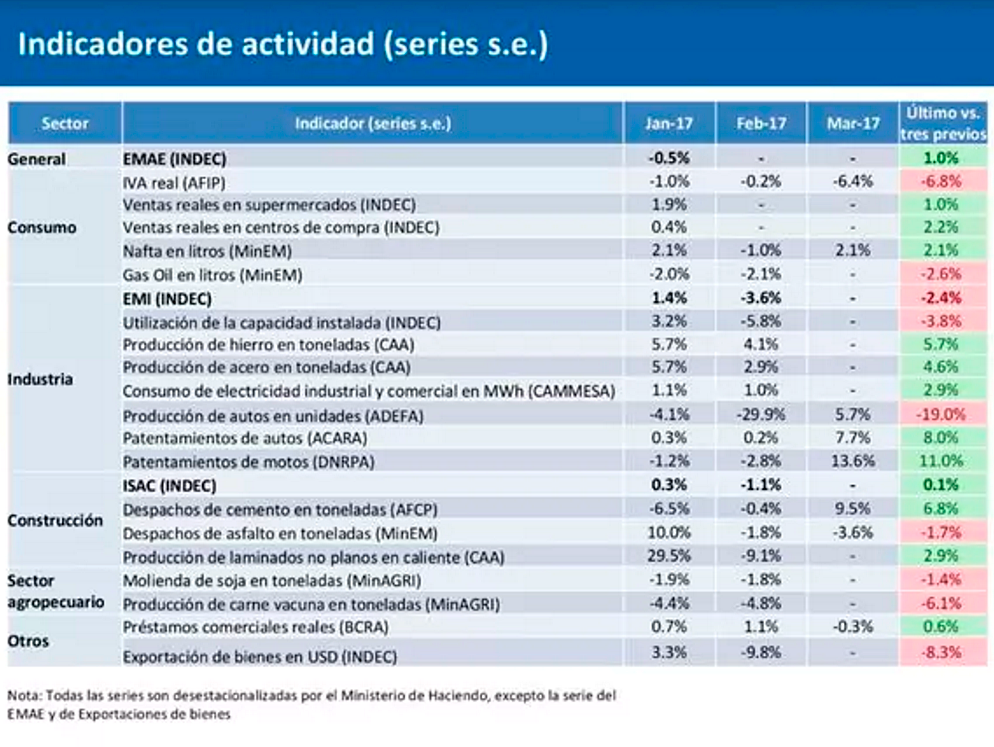 De los 22 indicadores todavía hay nueve en rojo, es decir con evolución negativa. En todos los casos se compara la evolución del último mes (en este caso marzo) contra la evolución de los tres meses previos. Y en realidad, hay algunas variables que aún tienen movimientos prácticamente neutros, por lo que en realidad no tienen luz roja ni verde, sino más bien amarilla.
