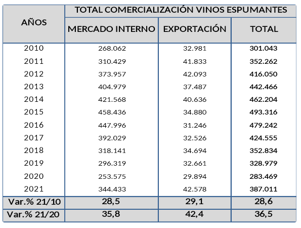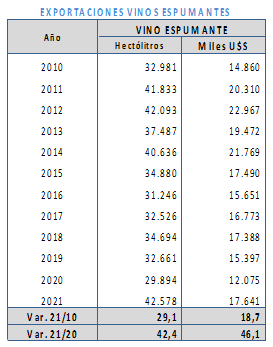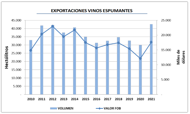 En 2021 se exportaron 42.578 hl de Vino Espumoso, por un valor de 17.641.000 dólares, Hinojosa destacó que “se llegó al récord histórico en el volumen exportado con un incremento del 42,4% con respecto al año 2020”.
