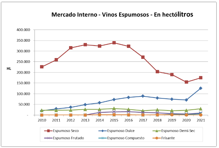 En el último año 2021, se vendieron 9 millones de litros más de Vino Espumoso que en el año 2020. El Espumoso Dulce fue el de mayor crecimiento (+78%) con un aumento de 5,5 millones de litros.