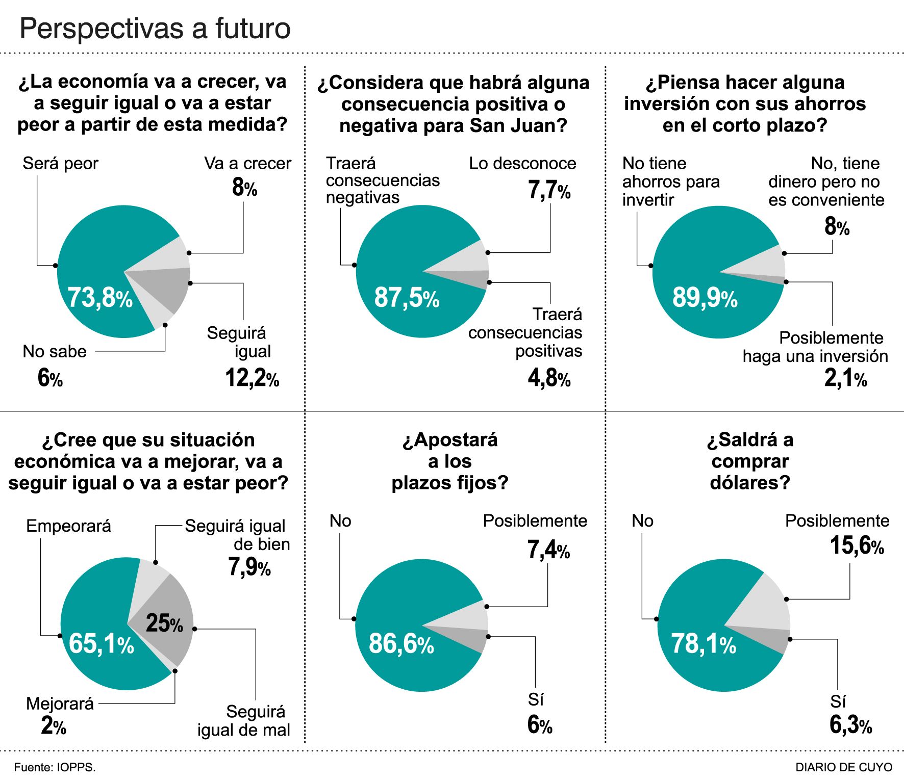 Pasando al plano personal, y en sintonía con el panorama anterior, casi un 90 por ciento ven negativa su situación económica. Dicen que igual de mal o empeorará, y apenas un 2 por ciento se anima a pronosticar que va a mejorar, ante las actuales circunstancias.