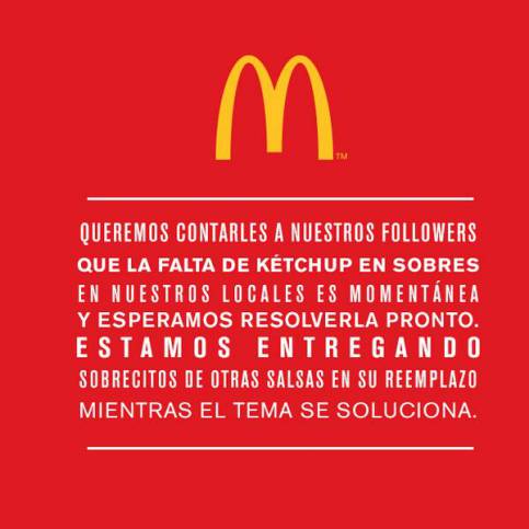 En el escrito, que McDonald’s subió a sus cuentas de Twitter y Facebook, informaron que están "entregando sobrecitos de otras salsas en su reemplazo mientras el tema se soluciona". "Sentimos el faltante de ketchup en nuestros locales. Se trata de un problema de abastecimiento que estamos resolviendo", agregó el mensaje difundido por la compañía.