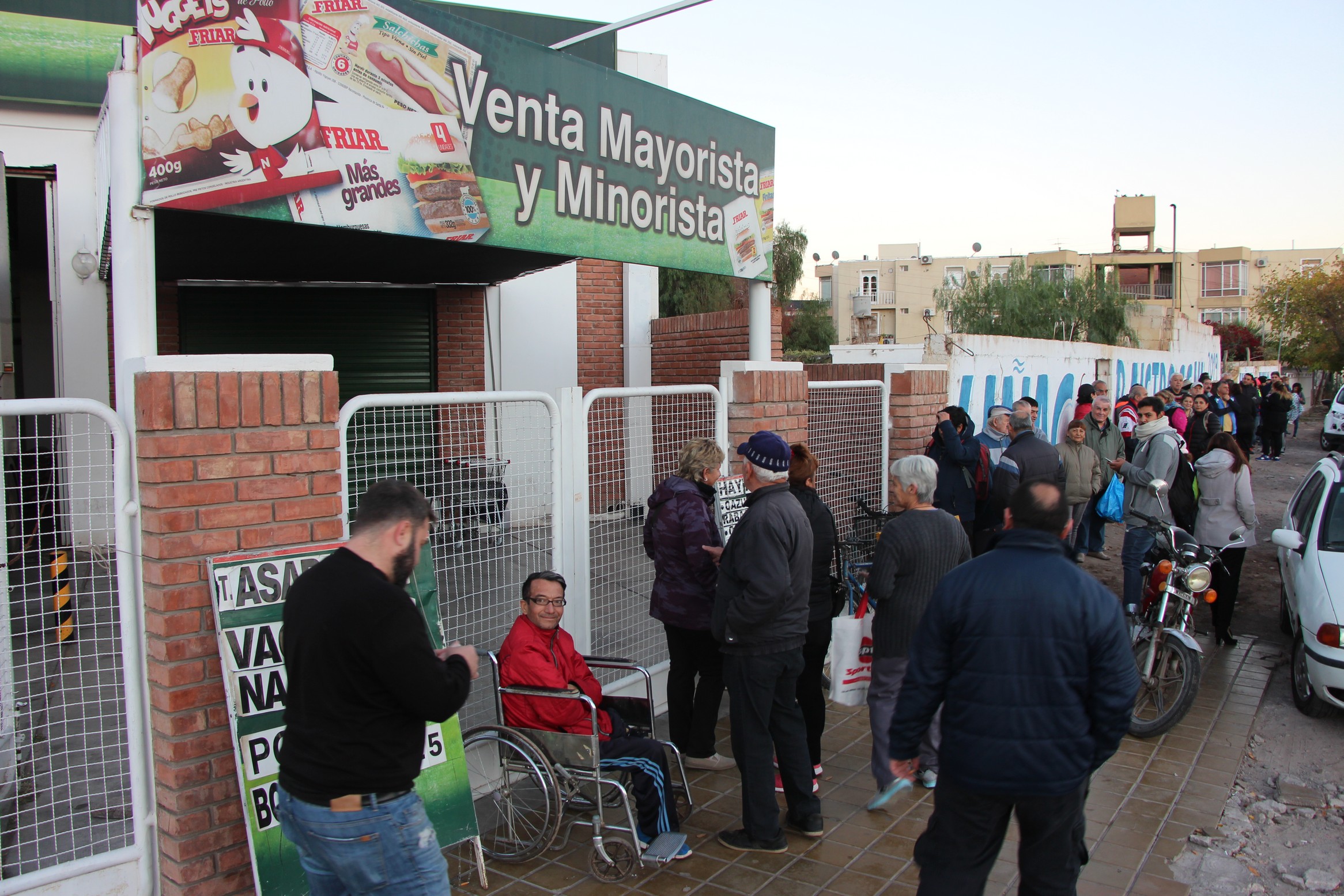 Minutos antes de las 8,30, cuando personal de la carnicería ubicada en Capital salió a repartir números para ordenar a quienes esperaban para comprar, Javier Tornello era el primero de la fila. El hombre llegó a las 5, en su silla de ruedas, por lo que la gente que se había acercado antes que él le dejó el lugar.