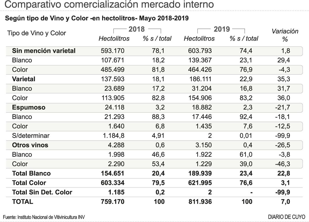 Los despachos de vino al mercado interno mostraron en mayo números favorables con un crecimiento del 7% con respecto al mismo mes del año pasado, mientras que en la comparación del período enero/mayo de 2019 con el del 2018 el aumento fue del 2,3%. En el sector bodeguero sanjuanino atribuyen el fenómeno a las señales de mejoramiento de la economía, que hacen que el consumidor vuelva a comprar el producto que había dejado de adquirir por la crisis que vivió el país. En términos de consumo, mayo fue el mejor mes del año.