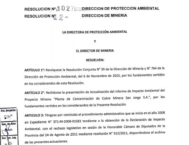 "Rechácese la presentación de Actualización del Informe de Impacto Ambiental del proyecto Minero "Planta de concentración de Cobre Minera San Jorge S.A.", dice la resolución 1027. La actualización a la que se refiere consistía en extraer el mineral sin procesar del yacimiento en Mendoza, transportarlo a San Juan para su procesamiento, lo cual abría la puerta a la apertura d euna nueva fuente de trabajo.