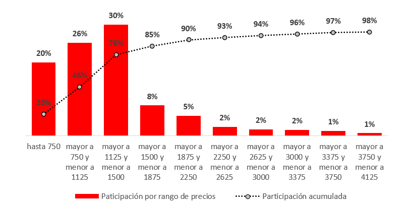 El análisis por precios muestra que el 76% del vino en botella consumido en estos canales, corresponde a precios menores a $1.500 por botella de 750 cc (precios sin IVA de setiembre de 2023). Si se toma en consideración los vinos de hasta $2.250 por botella de 750 cc, se agrega un 14% lo que acumula el 90% del total consumido, siempre respecto al consumo de vino embotellado.