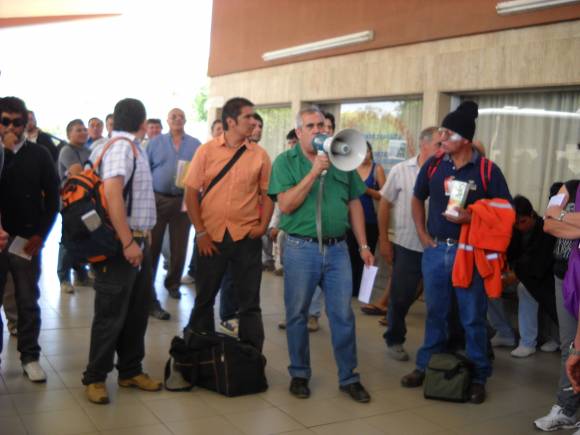 Trabajadores de la mina Veladero enrolados en OSMA -Organización Sindical Mineros Argentinos-, realizaron ayer en la terminal de micros una asamblea en reclamo de subas salariales. También pidieron reincorporación de su titular, José Leiva. La entidad está en vías de conseguir su personería jurídica.