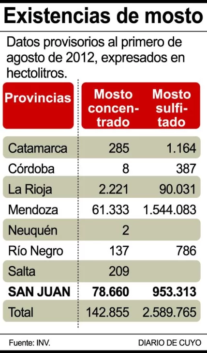 Ayer, el Instituto Nacional de Vitivinicultura dio a conocer los nuevos datos de existencias de productos vínicos en el país al 1 de agosto y en el mosto hay 142.855 hectolitros de concentrado y 2.589.765 hectolitros de sulfitado. Teniendo en cuenta que 740 litros de concentrado hacen 1 tonelada, el stock del concentrado es de 19.300 toneladas. Del mismo modo, 3.300 litros de sulfitado hacen una tonelada de concentrado, por lo que se suman 78.470 toneladas más. En total, el stock de existencias al 1 de agosto de 2012 es de 97.770 toneladas, contra las 195 mil toneladas que habían en enero. “Debido a la demanda, nadie objeta que el mercado internacional va a seguir comprando al mismo ritmo, y que el mercado interno demandará de aquí a fin de año unas 10 mil toneladas de concentrado, por lo quedará muy poco mosto en stock para el año próximo”, explicaron fuentes del sector.