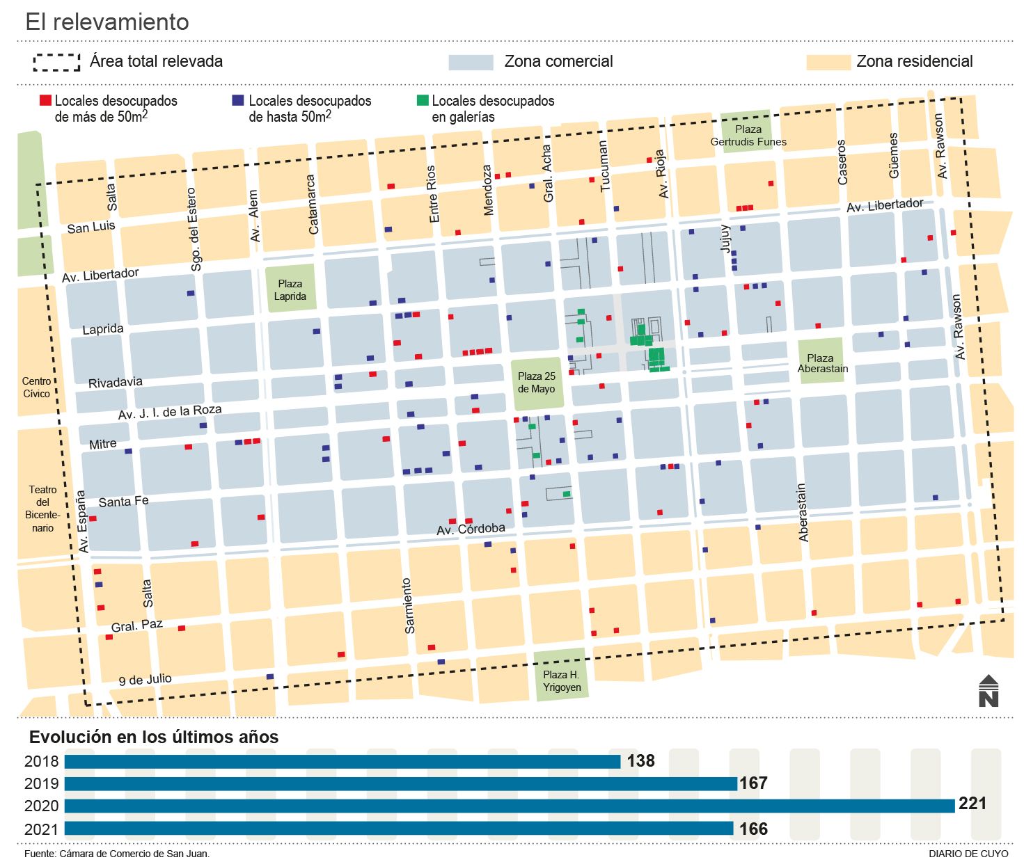 Como una forma de ahorrar costos, este año muchos de los comercios del microcentro sanjuanino optaron por mudarse a locales más chicos. Así lo revela el informe anual que elabora la Cámara de Comercio, que también indica que en el 2021 la cantidad de salones desocupados volvió casi a los mismos niveles que en el 2019, cuando todavía no había pandemia por el covid-19. De 221 locales que había desocupados en el 2020, este año hay 166, es decir que se ha registrado una caída del orden del 25%. En el 2019, según el mismo relevamiento, había 167 sitios disponibles.