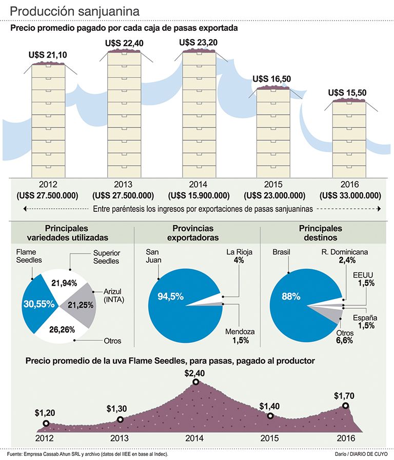 En los últimos 5 años el precio de la uva para pasa se mantuvo por debajo de los 2 pesos, salvo en 2014 donde coincidió una gran merma de uvas con un aumento de precios internacionales donde la caja llegó a 23,20 dólares (ver infografía).