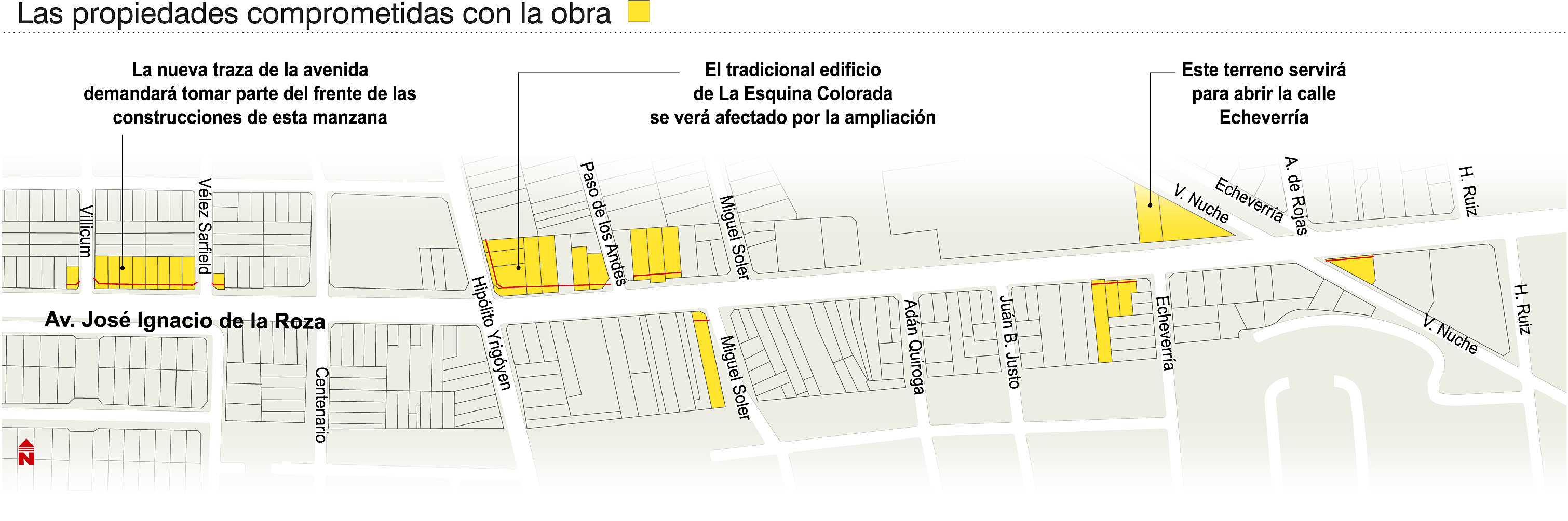 Los predios afectados van desde la calle Nuche, en Capital, hasta Villicum, en Rivadavia. Incluso en la última zona (ver infografía), las tareas de ensanche de la avenida todavía no se han licitado, pero ya los terrenos necesarios están en manos del Estado. En algunos casos, la porción que se necesita para la obra es de apenas algunos metros, pero en otros casos, como es para la apertura de la calle Echeverría, fueron necesarios casi 2.600 m2.