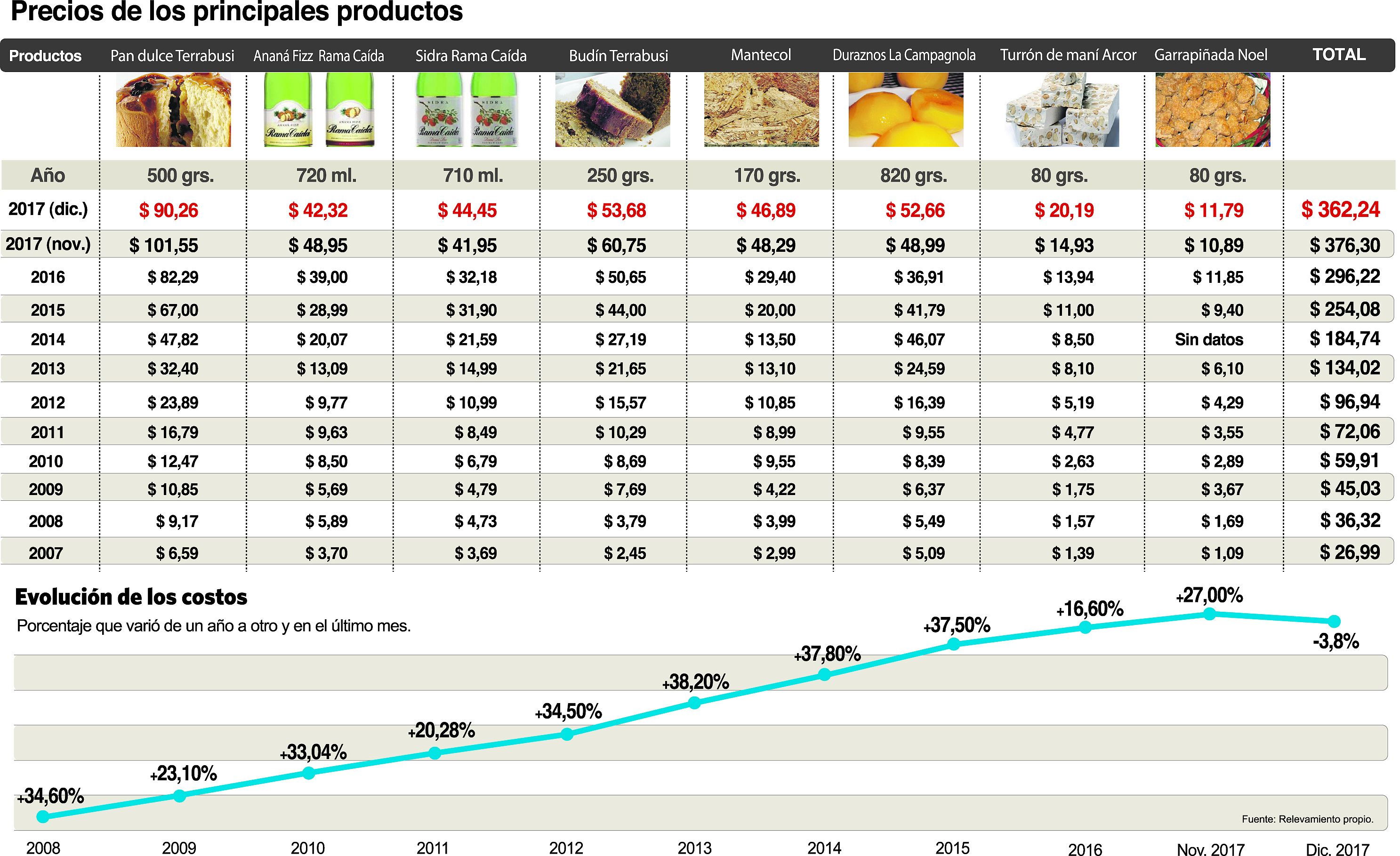 Los artículos que más bajaron ahora fueron el Ananá Fizz (15%), el budín (13%), el pan dulce (12,5%) y el Mantecol (3%). Por el contrario, hubo subas en los otros 4 artículos, la sidra, duraznos, turrón y garrapiñadas. El combo cuesta ahora 362,24 pesos, contra los 376,30 de poco más de un mes atrás. El relevamiento se hace con los precios de los principales supermercados de la provincia.