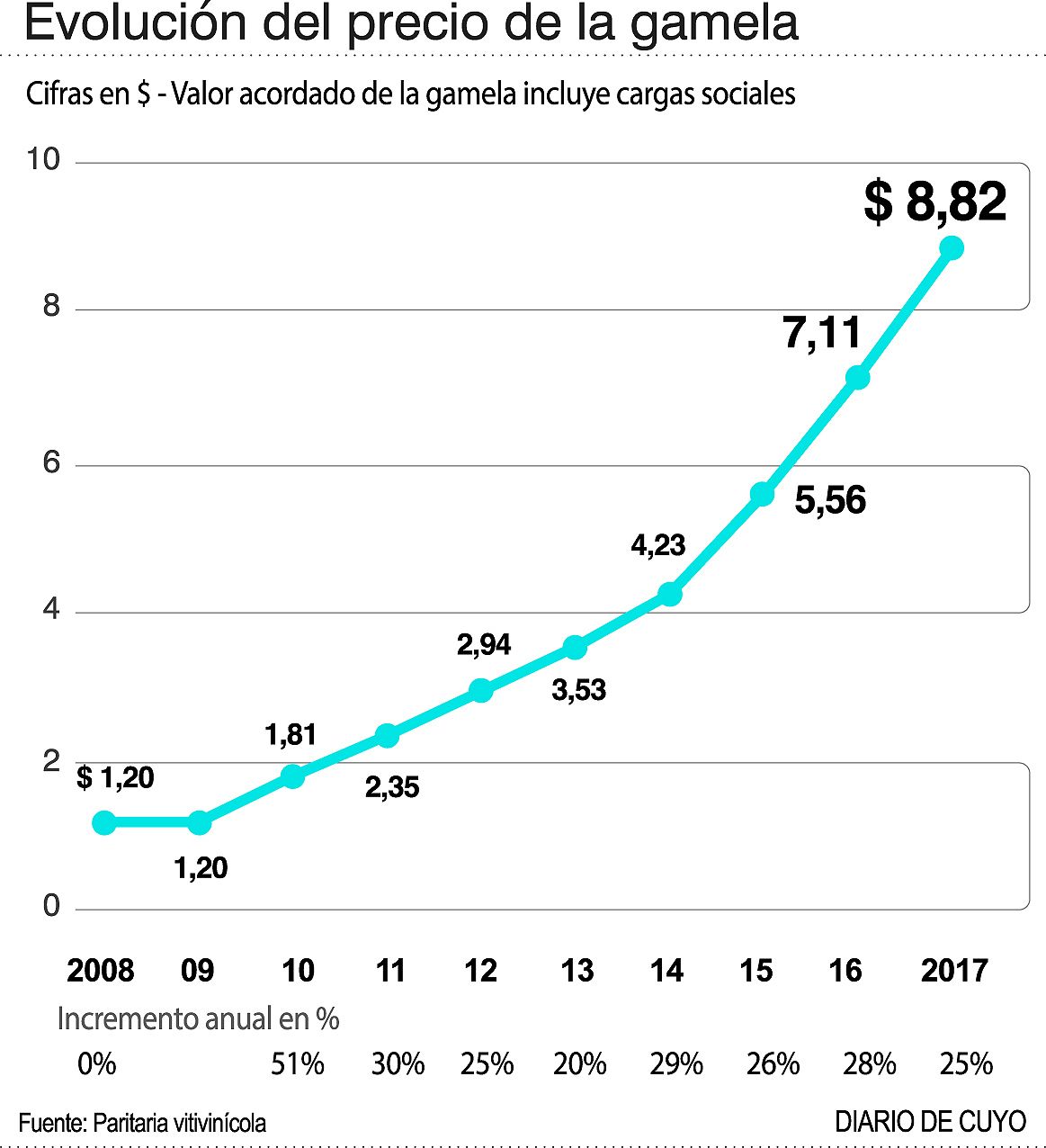 Un caso particular en estas negociaciones lo constituye el precio de la gamela o tacho de uva, según la jerga de una u otra provincia. Si bien lo que se acuerda en las paritarias vitivinícolas es referencial, es importante porque define los parámetros de la vendimia en materia de aportes y contribuciones, pero no establece el valor real de cuánto se lleva en limpio el cosechador a su bolsillo. Es que este valor rige únicamente para las uvas comunes y no es un guarismo estanco: por ejemplo, si es un viñedo nuevo (cepas con poca carga) o si la finca está atestada de malezas (complica el trabajo), el precio puede ser más alto, al igual que si se trata, por ejemplo, de variedades de uvas tintas, que provienen de cepas con menor carga. En otras palabras, el valor de lo que cobra el viñador se define generalmente en cada finca, y trepa bastante cuando se trata de uvas finas. Es porque la producción de estas variedades es sensiblemente menor al de una finca con fruta común y también porque se venden a mayor precio. Lo cierto es que para la vendimia pasada el valor que se acordó finalmente fue de 8,82 pesos, que fue un 25% superior al año anterior.