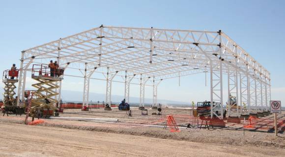 Para llegar a esta etapa de avance es necesario que la planta preensambladora, ubicada en Albardón (ver aparte), comience a producir las estructuras de hormigón y metálicas, que luego se subirán al yacimiento e in situ se montarán una por una, para así darle forma a las gigantescas naves que servirán para proteger todos los procesos que requiere el mineral en bruto.