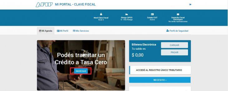 Para acceder a este tipo de crédito hay que ingresar a la página web de la AFIP, en la pestaña "Crédito Tasa Cero", donde el organismo determinará el importe mínimo y máximo que puede ser otorgado a cada solicitante.