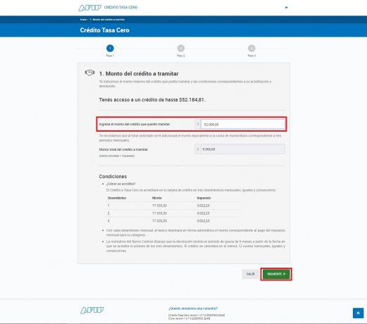 Una vez dentro del servicio, visualizarás el paso 1. En este paso, te indicaremos el monto máximo que podrás tramitar y lo que se te adicionará correspondiente a las cuotas mensuales de 3 períodos fiscales. Ingresá el monto y presioná "Siguiente".