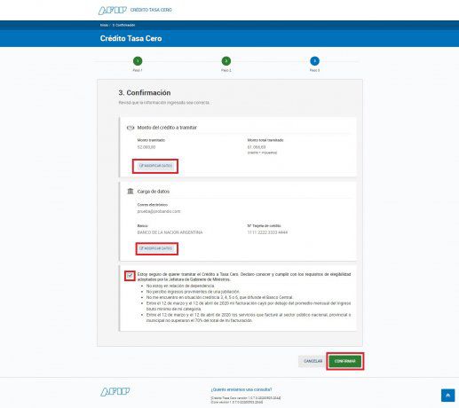 Por útlimo, te mostraremos los datos ingresados para que los valides o modifiques. Si los datos son correctos, tildá el mensaje de conformidad y presioná "Confirmar".