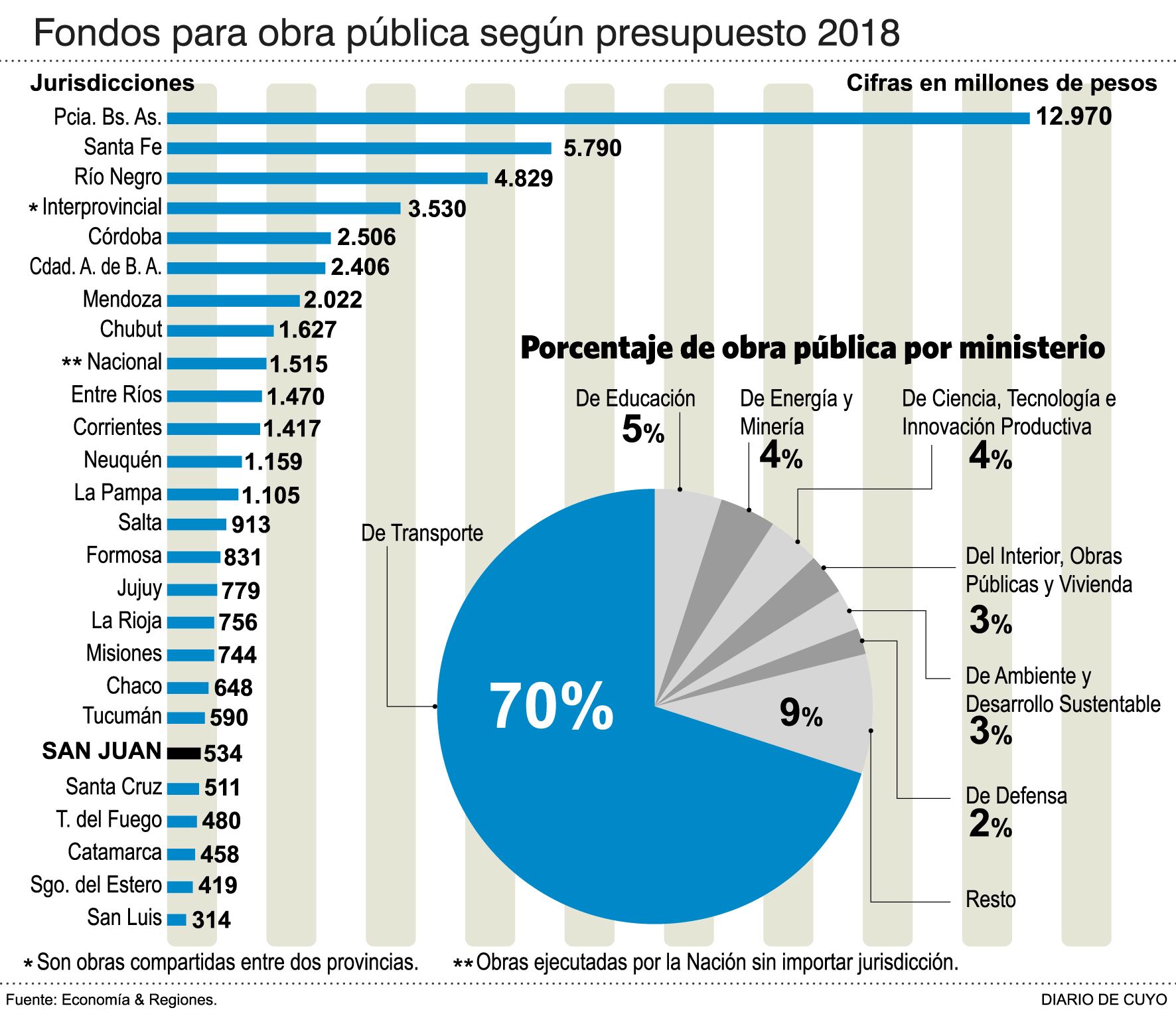En el gobierno provincial no niegan la preocupación existente por las obras que pueden verse afectadas ante el recorte de U$S 3.800 millones que anunció la Nación para este año, sin embargo estiman que San Juan será de las provincias menos afectadas porque fue una de las que menos recursos recibió en las partidas presupuestarias 2018 (ver infografía). Fuentes oficiales aseguraron que el plan de viviendas, por ejemplo, no se verá afectado porque se ejecuta con dinero proveniente del Fonavi, que corresponde al reparto de coparticipación que no será tocado en el ajuste. Además el gobernador Uñac ayer destacó que muchas obras se hacen con fondos provinciales.