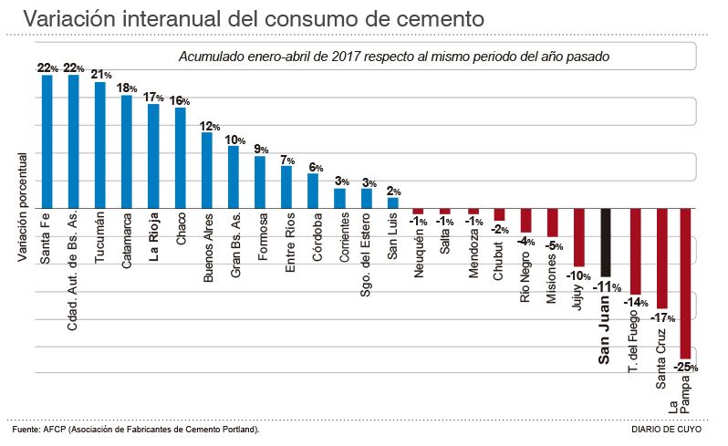 El sector de la construcción aún no comienza a mostrar signos de recuperación en la provincia, tal como había pronosticado el sector privado el mes pasado. Según las estadísticas que acaba de publicar la Asociación de Fabricantes de Cemento Portland, en abril el consumo de cemento en San Juan cayó 22% respecto a igual mes del periodo de 2016. Se utilizaron el mes pasado 16.437 toneladas de cemento, es decir; 3.633 toneladas menos que las 20.070 de hace un año.