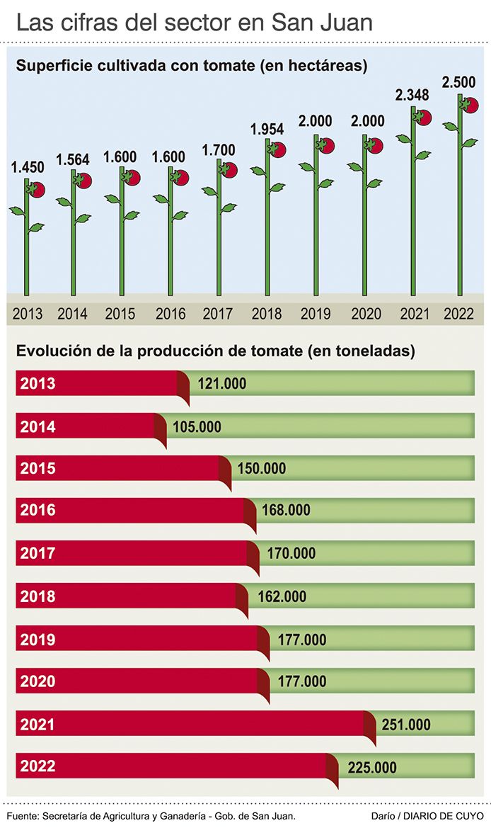 Dos cultivos en San Juan, en los que hay una alta tecnificación, como el tomate para industria y el pistacho, han crecido en cantidad de hectáreas esta temporada. Pero, como contrapartida, y por la incidencia del factor climático, como los fuertes vientos, la ola de calor y el efecto de la crisis hídrica, han hecho que se hayan perdido chacras, según la consulta a fuentes del sector.