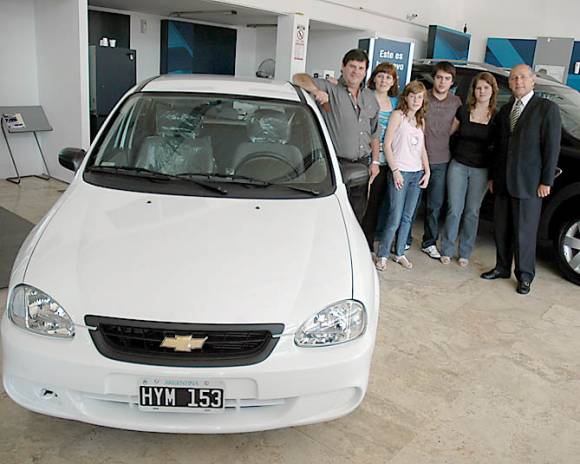 La concesionaria American Cars entregó el primer auto 0KM correspondiente al plan de financiación del gobierno. El beneficiario fue Francisco Doña (izq), que en la foto posa junto su familia y el titular de la agencia, Víctor Hugo Malaisi, con la llave de su auto. Se trata de un Corsa Wagon Life.