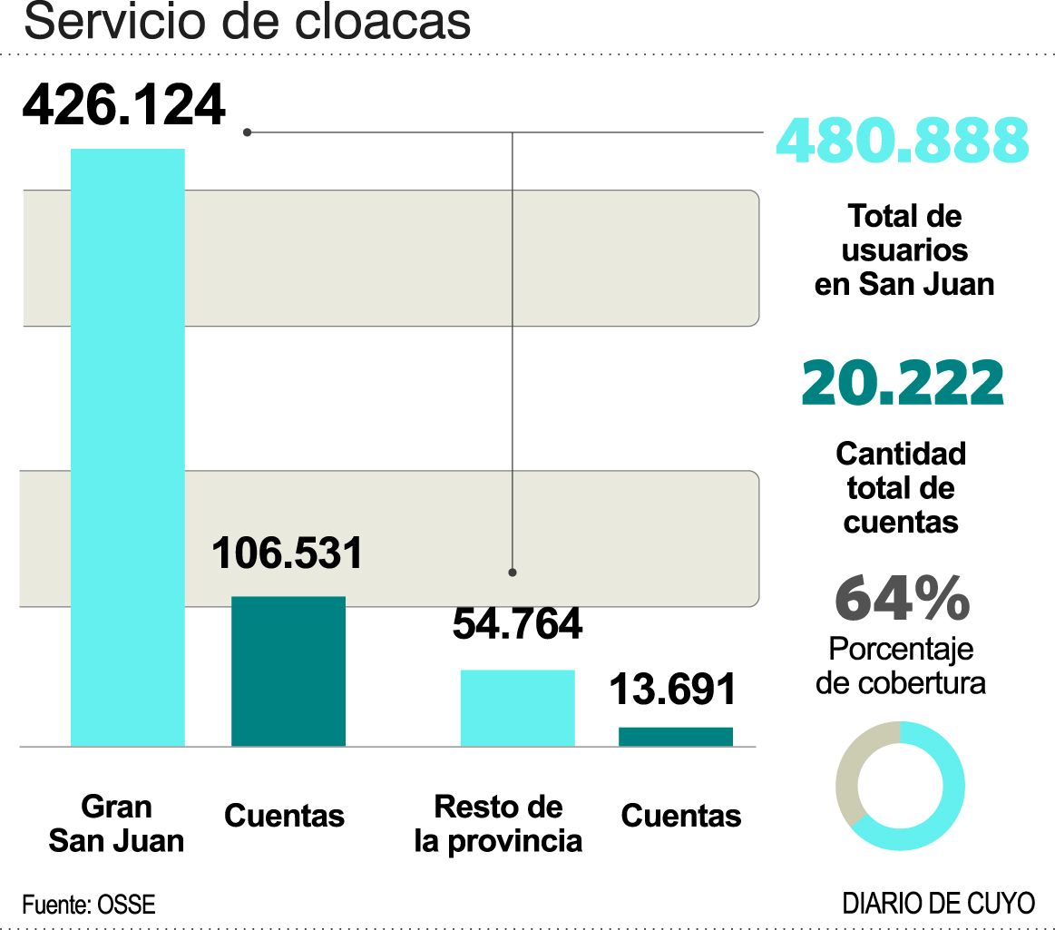 En la actualidad el organismo brinda el servicio de saneamiento a poco más de 480.000 personas que corresponden a 20.222 conexiones domiciliarias. Estas cifras representan el 64% de la población de San Juan.