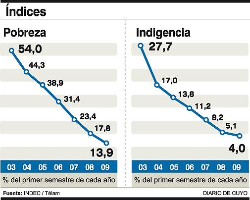 De esta forma la tasa de pobreza cayó 3,9 puntos respecto al mismo periodo de 2008, cuando había sido de 17,8 por ciento. A su vez, la indigencia se redujo 1,9 puntos con relación al primer semestre del año pasado, momento en el que se había ubicado en el 5,9 por ciento.