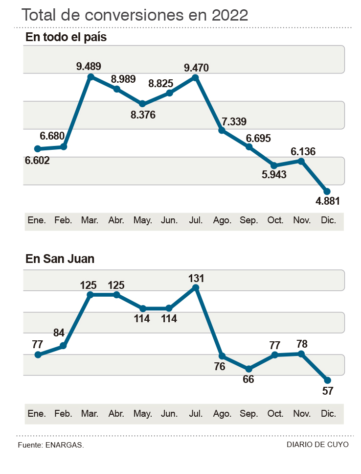 Durante el año que acaba de finalizar, en San Juan se instalaron equipos de Gas Natural Comprimido (GNC) en 1.124 vehículos, una cifra que es un 36% inferior a las 1.773 conversiones registradas en el 2022, según datos del Ente Nacional Regulador del Gas (Enargas). La cifra, que es la más baja de al menos los últimos cinco años, se explica por los altos costos de los equipos y las dificultades para acceder a la financiación.
