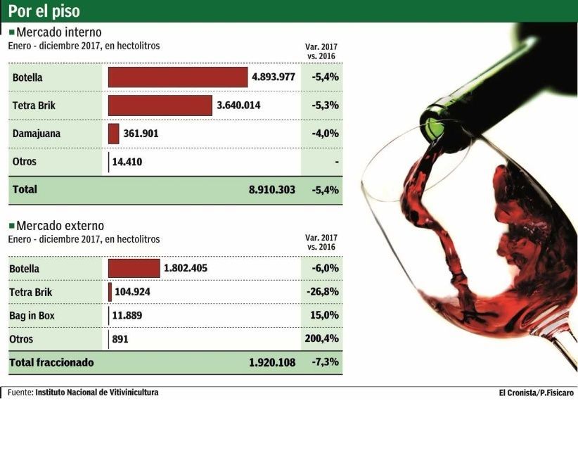 El consumo de vino cayó 5,4%, a 8,91 millones de hectolitros, baja que se suma a la registrada en 2016, de 8,3%, según datos de Instituto Nacional de Vitivinicultura (INV). En la última década (excepto los últimos dos años), las bodegas habían logrado mantener las ventas al mercado interno, muy leves alzas o bajas y el promedio anual de consumo solía superar los 10 millones de hl. Las ventas internas del año pasado son, así, las más bajas de la historia, al menos desde los años 60, desde cuando se tiene registro.