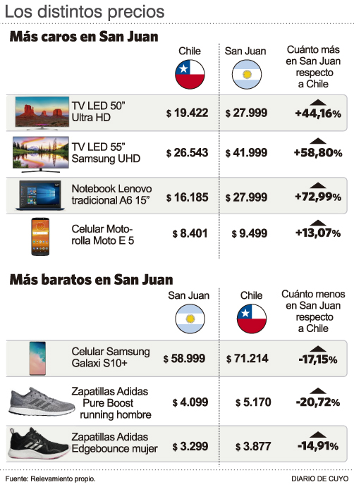La inflación de precios, que es superior a la devaluación frente al dólar en Argentina, sumada a la devaluación chilena, provocó en los últimos dos o tres meses que de nuevo vuelva a ser conveniente comprar productos de electrónica en tiendas de Chile. De acuerdo a un sondeo realizado ayer en páginas online de una misma tienda en ambos países, las notebook y los televisores con tecnología Led 4K se consiguen mucho más baratos en Chile (ver infografía). Por ejemplo, una misma notebook Lenovo aquí se consigue un 72,9% más cara, ya que cuesta 27.999 pesos (610 dólares), mientras que allá el precio es de 16.185 pesos si la convertimos a nuestra moneda. Esa notebook en Chile cuesta 249.990 chilenos, y teniendo en cuenta que allá el dólar cotiza a 694 pesos (según Valor-dolar.cl) son 360,29 dólares. Un Samsung Led de 55′ cuyo precio en San Juan es de 41.999 pesos, allá se consigue al equivalente de 26.543 pesos argentinos.
