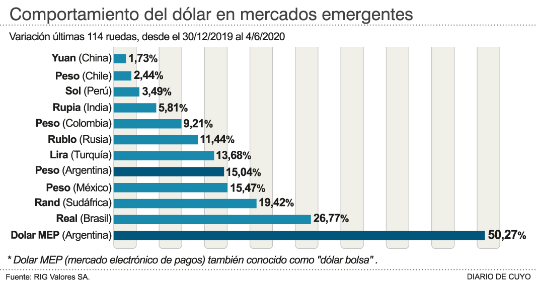 El asesor financiero Marcelo Dormi explicó que en lo que va del año, el dólar en Brasil subió nominalmente contra el real un 27,5 moneda brasileña se devaluó un 21.5 %, entre enero y el 4 de junio. El 31 de diciembre un dólar costaba 4 reales y ayer hacían falta 5,10 reales para comprar un dólar. En las últimas semanas la moneda brasileña se tonificó porque en mayo la devaluación del real: el 22 de mayo pasado por ejemplo, el dólar había subido nominalmente contra el real un 37,69 %. Respecto al peso argentino, en lo que va del año el dólar (oficial) en Argentina subió nominalmente contra el peso un 15,2%, lo cual equivale a decir que el peso argentino se devaluó un 13,25% contra el dólar. El 31 de diciembre hacían falta $59,80 para comprar un dólar, y ayer se adquiría con $68,90. Dormi explicó que usó de referencia el dólar mayorista Interbancario que se negocia en MAE, "dado que es el precio más limpio que existe".