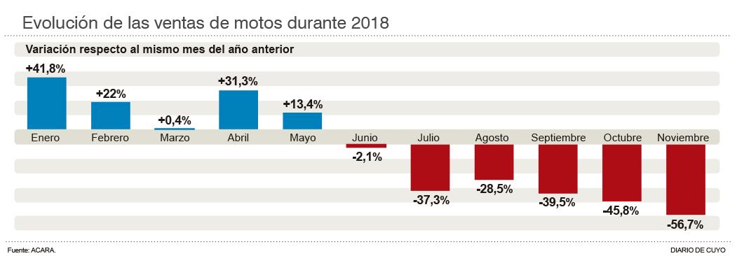 Para terminar de entender el panorama puede citarse que mientras en enero se vendieron en el mercado local 1.208 unidades, según datos de la Asociación de Concesionarios de Automotores de la República Argentina (ACARA), mientras que abril fue el mejor mes del 2018, con 1.356 transacciones, el mes pasado apenas se comercializaron 504 motovehículos, también la cifra más baja en lo que va del año.