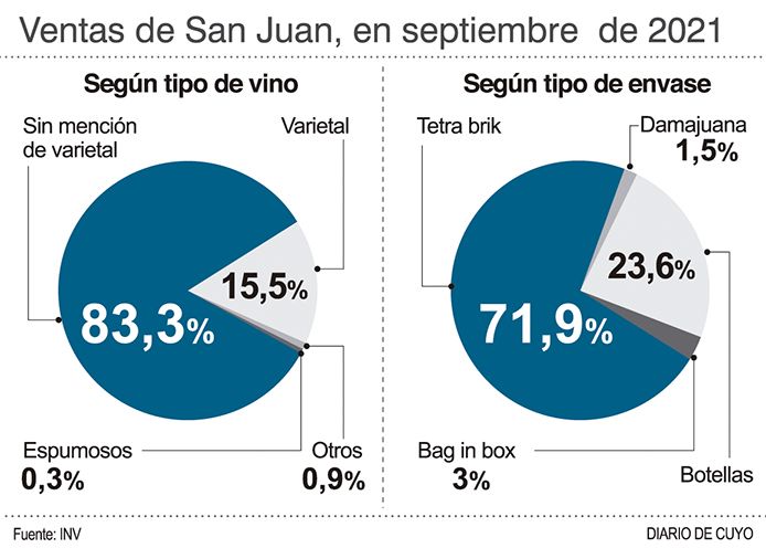 Las ventas de vino en el mercado interno durante el mes de septiembre alcanzaron un volumen de 730.528 hl, lo cual evidencia una disminución del 16,1% con respecto a igual mes del año anterior. El 66,5% corresponde a vinos sin mención varietal, el 28,4% a varietales, el 4,6% a espumosos y el 0,5% a otros vinos (cóctel de vino, gasificado y especial). Los vinos espumosos aumentaron un 11,1%, los vinos sin mención varietal cayeron un 14,3%, los varietales un 22,8% y los otros vinos un 19,8%, con respecto al mismo mes del año anterior. En envases, subieron las ventas de vino en lata -que no existe en San Juan- y de bag in box, mientras que disminuyeron en botella, tetra brik, damajuana y otros envases.