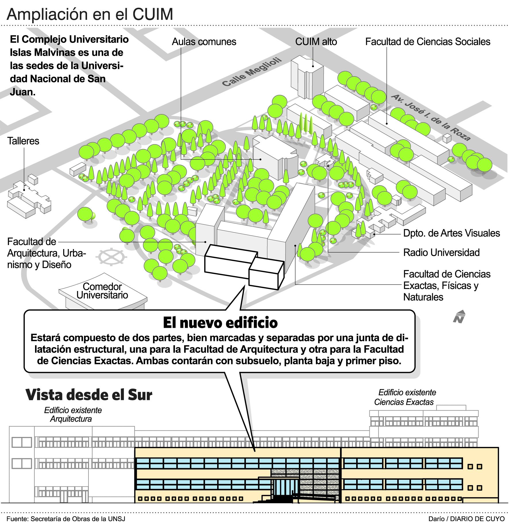 Detrás de la construcción de la Escuela de Música, el edificio para las dos facultades será el más importante que se llevará a cabo y que irá destinado exclusivamente para los alumnos de la UNSJ. Estará emplazado en un terreno donde hoy existe un estacionamiento y que se encuentra contiguo a los edificios de las dos facultades (ver infografía).