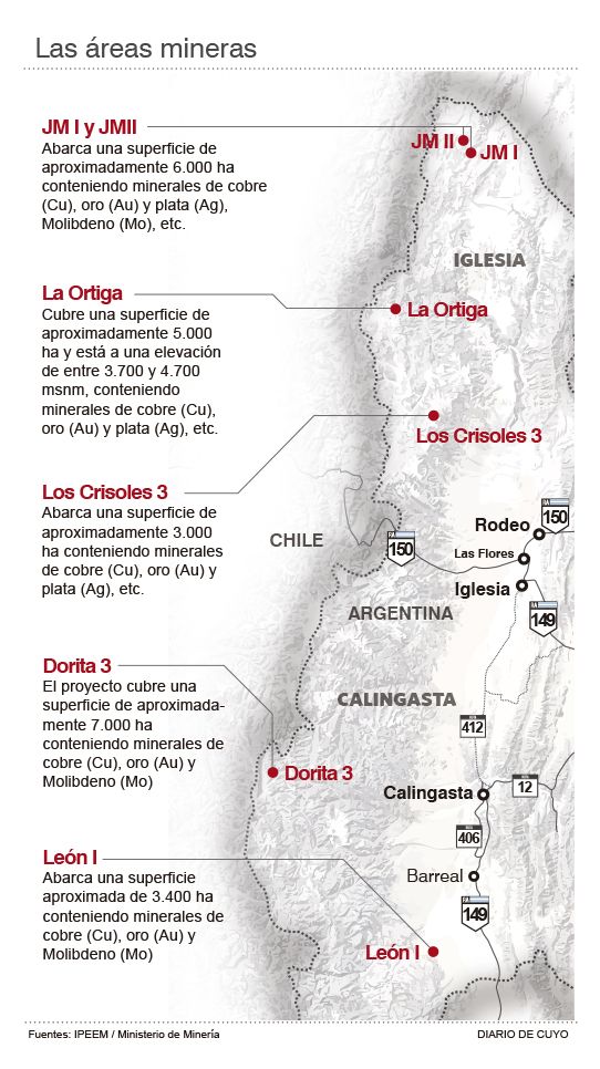 Hay cuatro áreas que están ubicadas en Iglesia, en las inmediaciones del Valle del Cura, y que guardan potenciales reservas de oro, entre otros metales: La Ortiga, JMI, JMII y Los Crisoles. Las otras dos están en Calingasta, zona especialmente con reservas de cobre, y son León 1 y Dorita 3 (ver infografía). ""Ante la incertidumbre económica en Argentina los inversores mundiales no consiguen fondos en sus casas matrices o el aval de las bolsas internacionales para lograr financiamiento que permita el reaseguro de las inversiones, por eso, atento a todo el problema que hubo por las elecciones y la disparada del dólar decidimos una nueva prórroga", explicó una fuente del Ippem. Agregó que de los dos últimos pliegos que se habían vendido, una firma radicada en Chile llamó por teléfono y manifestó el desinterés en realizar la inversión porque los inversionistas no le permitían invertir en Argentina.