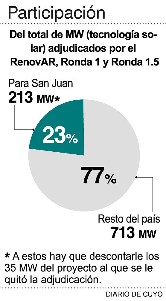El Parque Solar Sarmiento salió adjudicado en la primeras rondas del Renovar, dentro de un lote de siete proyectos sanjuaninos (ver infografía) en los departamentos de Ullum, Sarmiento, Albardón e Iglesia. Entre todos iban a requerir una inversión privada de 270 millones de dólares, e iban a aportar en conjunto 213 MW de potencia eléctrica, el 44% del total de la demanda de San Juan que suele alcanzar en las siestas de verano los 480 MW. La provincia, en la licitación del Renovar 1.5 había conseguido el 23% de los 926 MW adjudicados en todo el país. Más tarde, en la Renovar 2; logró con 3 proyectos insertar 272 MW de energía solar, el 34% de los 816 en total que se distribuyeron en Argentina. La caída del proyecto de Soenergy no mueve mucho la aguja, ya que sólo resta 35 MW.
