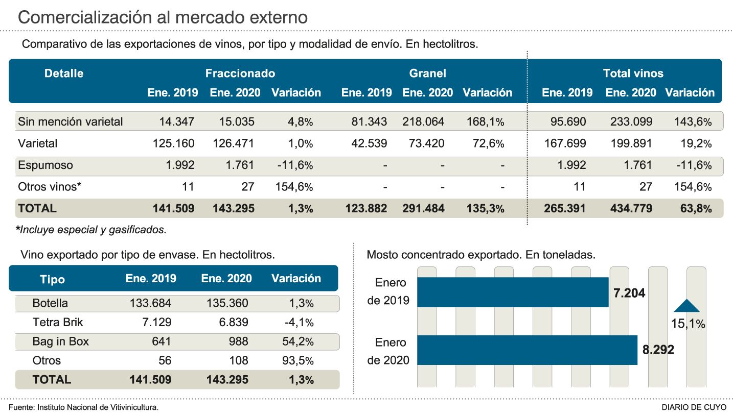 El volumen de los embarques logrado lo convierte al primer mes del 2020 en el mejor de los últimos cinco eneros: en ese mes del 2019 se exportaron 26,5 millones de litros al mundo, en enero del 2018 las ventas externas alcanzaron los 13,6 millones de litros, ene enero de 2017 fueron de 14,6 millones de litros y en igual mes del 2016, alcanzaron los 18,8 millones. ""El volumen de vino exportado en el mes de enero, debe ser un récord histórico", dijo el productor Juan José Ramos, quien dirige la Asociación de Viñateros Independientes.