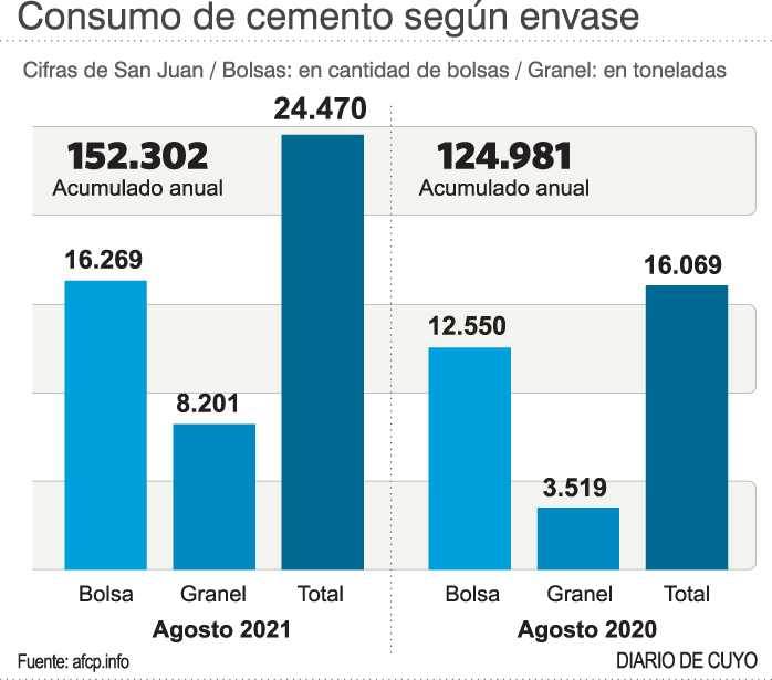 El sector de la construcción está mostrando signos de recuperación interesantes que se reflejan en el consumo que se hace de uno de los principales insumos, el cemento. Según las últimas estadísticas que acaba de publicar la Asociación de Fabricantes de Cemento Portland (AFCP), en agosto pasado el consumo de cemento en San Juan creció 52% respecto de igual mes del 2020. En el mes analizado se utilizaron en esta provincia casi 24.500 toneladas de cemento, frente a las poco más de 16.000 toneladas utilizadas en agosto del año pasado. Referentes del sector indicaron que se debe a la tracción que ejerce la obra pública, con viviendas, el dique Tambolar, la fábrica de paneles solares y el velódromo, entre otras; que han revitalizado la actividad. El buen ritmo de obra actual es una buena noticia, porque el aumento del nivel de actividad se tradujo también en un incremento de la mano de obra: según cifras de la Unión Obrera de la Construcción de la República Argentina (UOCRA), actualmente la mano de obra ocupada supera los 9.000 trabajadores en San Juan. El efecto de la obra pública se puede comprobar al mirar las cifras del consumo de cemento a granel -el termómetro de las obras grandes- que trepó a 8.201 toneladas en agosto del 2021, un 133% más que las 3.519 toneladas del 2020. Las cifras de AFCP indican que 21 provincias mostraron incrementos interanuales en el consumo total de cemento. San Juan, con el 52%, se ubicó en segundo lugar tras Tierra del Fuego (55,5%), y superó ampliamente la media nacional que fue del 18%. Algunos constructores advirtieron que hay que destacar que se está comparando contra un mes del 2020 bajo, que estuvo atravesado por las restricciones de la pandemia. Y si bien es así, también es cierto que las cifras actuales de consumo superan los niveles prepandemia: en agosto de 2019 se consumieron en San Juan 22.624 toneladas, frente a las 24.470 actuales, lo cual refleja este año un incremento del 8,16%.