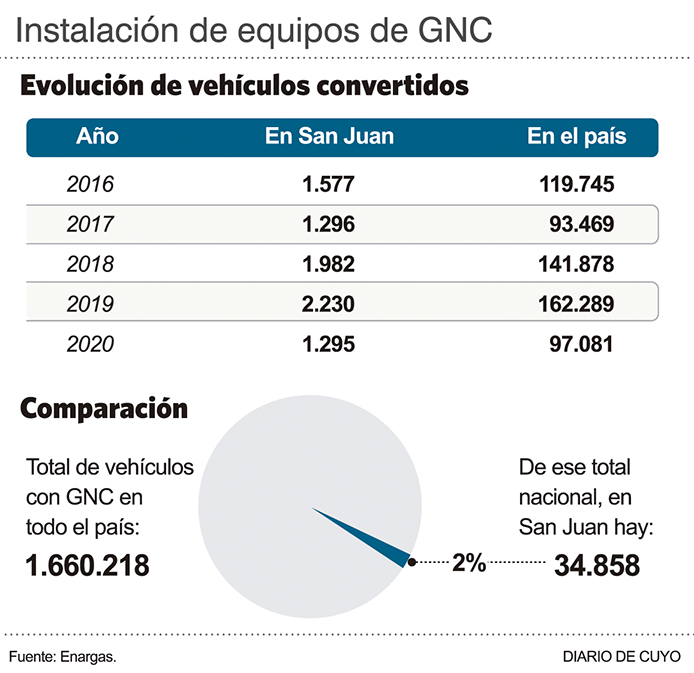 Durante el año que acaba de finalizar, en San Juan se instalaron equipos de Gas Natural Comprimido (GNC) en 1.295 vehículos, una cifra que es un 42% inferior a las 2.230 conversiones registradas en el 2019, según datos del Ente Nacional Regulador del Gas (Enargas). La cifra, que es la más baja de al menos los últimos cinco años, se explica por la paralización de actividades ocasionadas por la pandemia, por ejemplo la falta de clases y el menor movimiento de los rodados por la reducción de la actividad económica.
