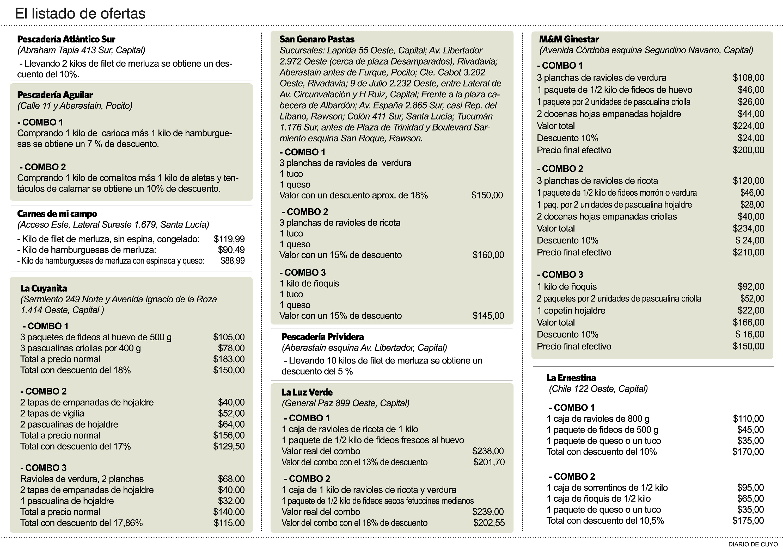 Para esta Semana Santa y por segundo año consecutivo, la canasta de Pascua incluye pescado entre las ofertas. Así las cosas, los sanjuaninos podrán adquirir combos con productos de mar con descuentos de hasta el 10% y pastas, como fideos, ravioles, ñoquis y discos para empanadas, con rebajas de hasta el 18%. También hay promociones con frutas y verduras.
