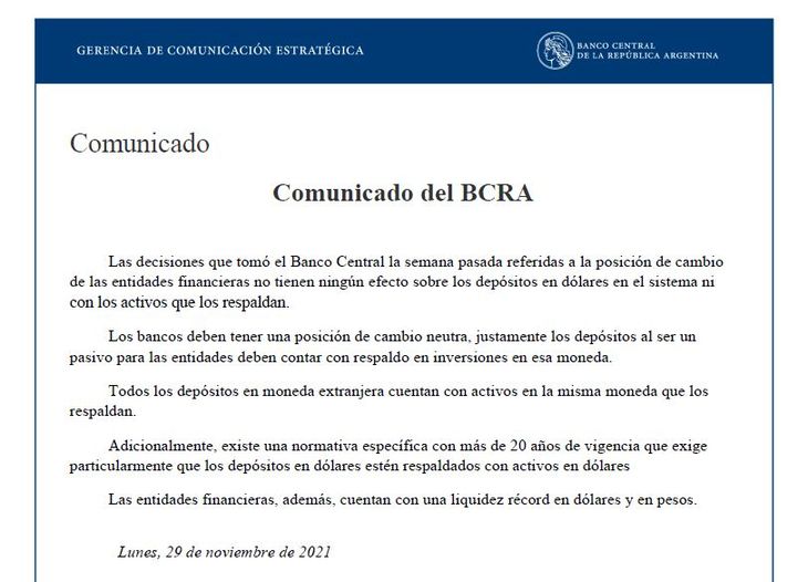 El mensaje que se marcaba en los grupos como "reenviado muchas veces" dice: "Recibido hace unos minutos, lo comparto: Es de suma importancia comunicarles que se oficializó, mediante el Comunicado “A7405 y A7407”, ambos del Banco Central de la República Argentina (BCRA) que, con vigencia a partir del día 01/12/2021 (miércoles). Los bancos y/o entidades financieras enmarcadas dentro del circuito financiero argentino, no podrán tener en sus reservas divisas extranjeras. Toda posición financiera o equivalente en dólares, deberá ser liquidada y remitida a las reservas del BCRA. En otras palabras, un CORRALITO ENCUBIERTO. Por lo que le recomendamos a aquellos que posean dólares en cuentas bancarias, que el día lunes y martes de esta semana entrante, saquen turno y/o se apersonen a su banco para retirar esos saldos".