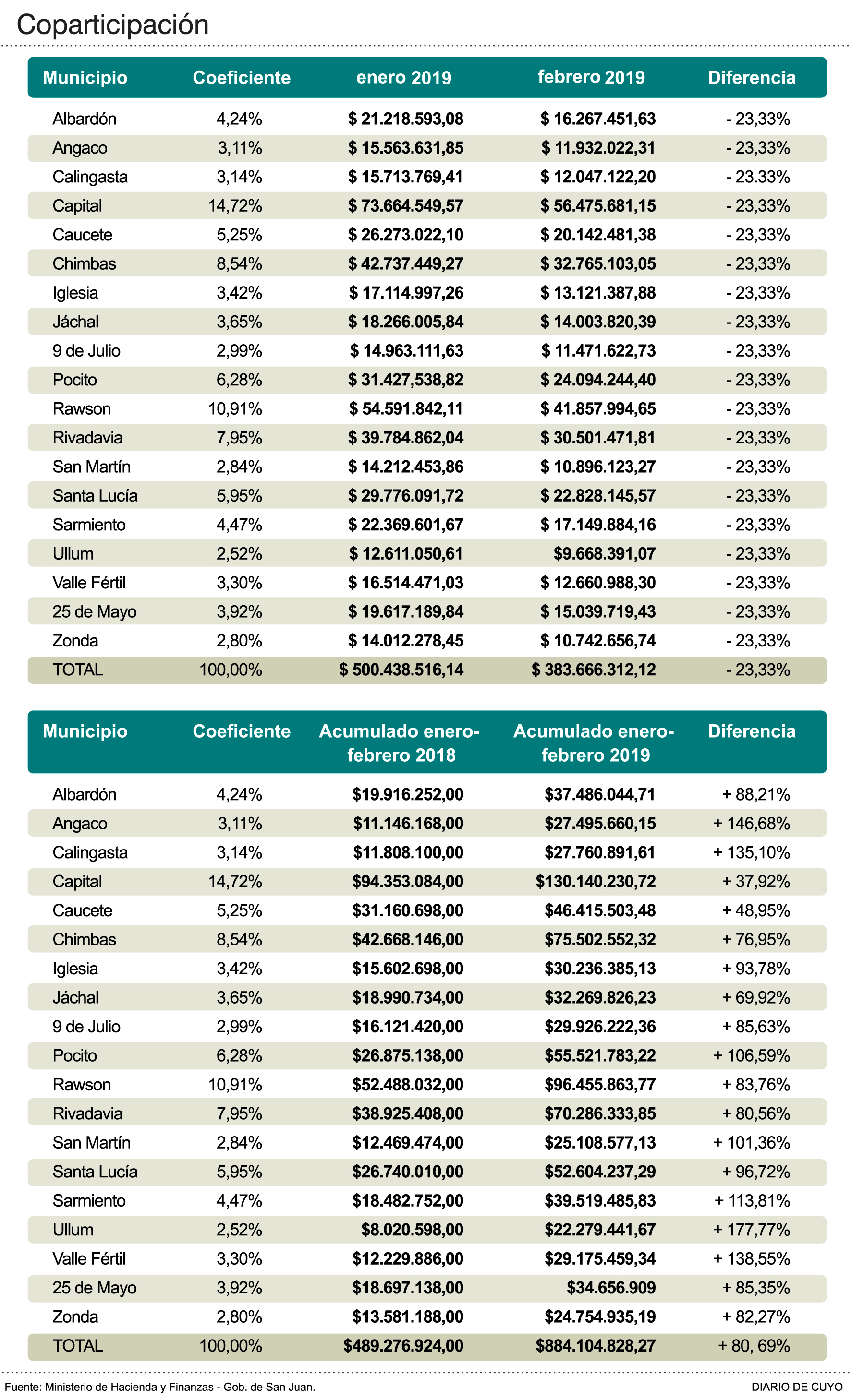 La caída en febrero de la recaudación de impuestos nacionales impactó de lleno en el flamante sistema de coparticipación provincial. Como el mecanismo está atado a la percepción de los tributos, con respecto a enero hubo una baja del 23,3 por ciento de los recursos que se distribuyeron a los departamentos. Pese a la merma, los municipios siguen recibiendo más dinero en comparación al esquema que regía el año pasado. Así, lo que ingresó en enero y febrero de este año creció 80,6 por ciento con respecto al mismo período de 2018 (Ver infografía). En el Ministerio de Hacienda están al tanto de los vaivenes y vislumbraban que el mes que pasó iba a estar flojo en materia recaudatoria. Pero en el horizonte ven que en marzo y abril repuntarán los recursos.