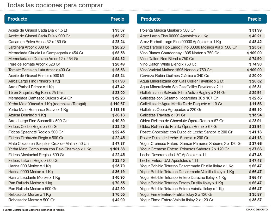 En el listado de artículos disponibles hay comestibles como puré de tomate, mermelada, azúcar, aceite, leche en polvo, harina, arroz, fideos hasta artículos de limpieza, como lavandina, detergente y jabón de lavar en polvo.