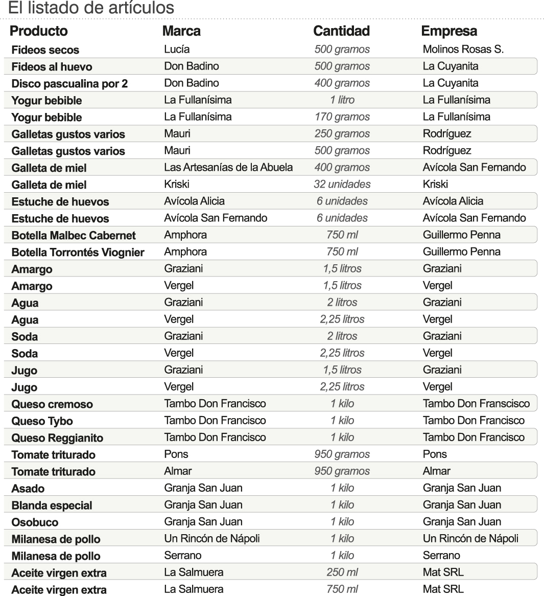 El listado de productos fue consensuado con 18 supermercadistas y proveedores de la provincia y los valores de los artículos se darán a conocer en los próximos días. Entre ellos hay fideos, yogurt, galletas, huevos, vinos, soda, jugos, quesos, tomate triturado, carnes y milanesas de pollo.
