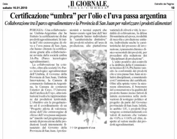La prensa escrita de Umbria, en Perugia Italia, ha difundido este último fin de semana la certificación que lograron dos agroalimentos sanjuaninos en aquel lugar. Se trata del aceite de oliva extra-virgen y las pasas de uva, donde los profesionales y técnicos expertos han identificado las "características distintivas" de los productos para proceder a la redacción de las normas de referencia del tipo DOP (Denominación de Origen Protegida).