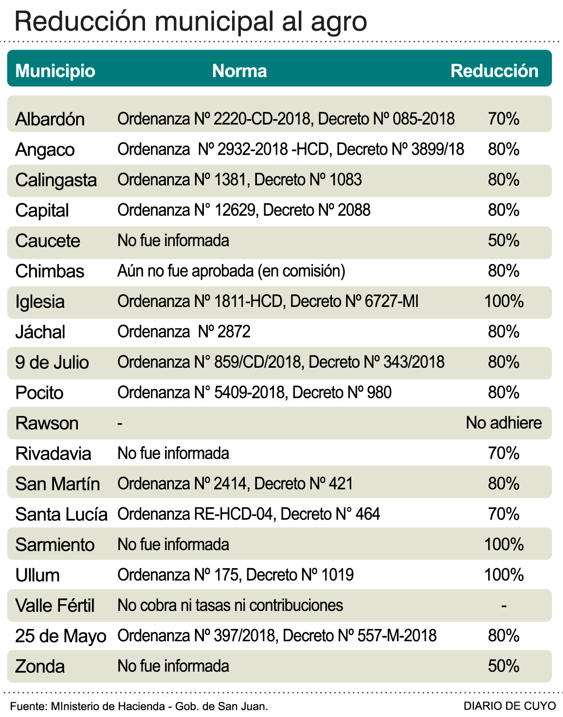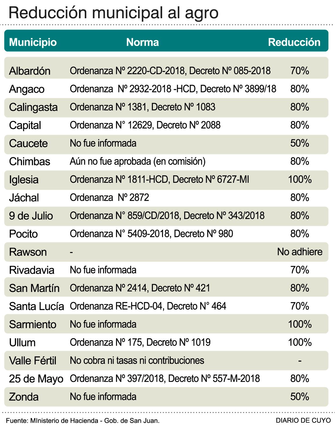 La mayoría de las municipalidades ya redujeron parte de los tributos que gravan el riego agrícola en los meses de noviembre y diciembre de este año, con lo cual los productores van a pagar una boleta de consumo de energía menor, al menos por dos meses. Las facturas llegarán con vencimientos a partir de enero de 2019, y los productores ya están festejando el alivio que esto significará. En cambio desde otros sectores como la industria, minería, construcción y exportadores seguirán insistiendo con reuniones con los jefes municipales para ser también incluidos el año próximo (ver aparte). Hay 13 comunas (ver infografía) que a través de ordenanzas redujeron entre 50 y 80% la contribución municipal que cobran por el uso de espacio aéreo, mientras que otras tres directamente eximieron del pago. De las tres que quedan, Valle Fértil no cobra esas tasas a la producción, Chimbas tiene la ordenanza en la comisión del Concejo Deliberante y Rawson no la aplicó.