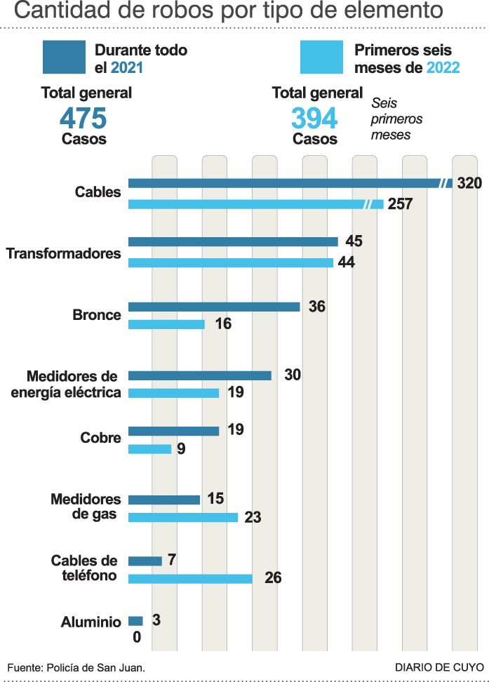 En un encuentro con productores de fruta, olivos, hortalizas, uvas y del sector bodeguero, desde el Gobierno provincial salieron a mostrar ayer la estrategia implementada para frenar los robos que afectan a los hombres de campo. En particular se trata de cables de electricidad, transformadores y medidores de luz y gas, que llegan a paralizar la actividad en las fincas y chacras. La reunión se dio en un contexto de fuerte crecimiento de los casos porque, según estadísticas de la Policía de San Juan, durante todo el 2021 se registraron 475 sustracciones y sólo en los primeros 6 meses de esta año ya hay 394 hechos que, de mantenerse la tendencia, superarán con creces las cifras del año pasado.