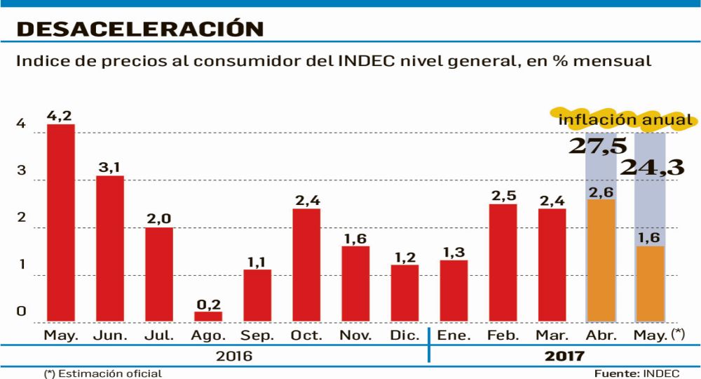 La cifra permitirá confirmar una drástica desaceleración en la suba de precios respecto de abril, cuando quedó en el 2,6%. Y lo más destacado: permitirá confirmar una sensible caída de la inflación anual, desde el 27,5% de abril al 24% actual. Representará un recorte de 16 puntos porcentuales en el índice desde el 40% que llegó a haber el año pasado según las consultoras privadas y las mediciones provinciales.