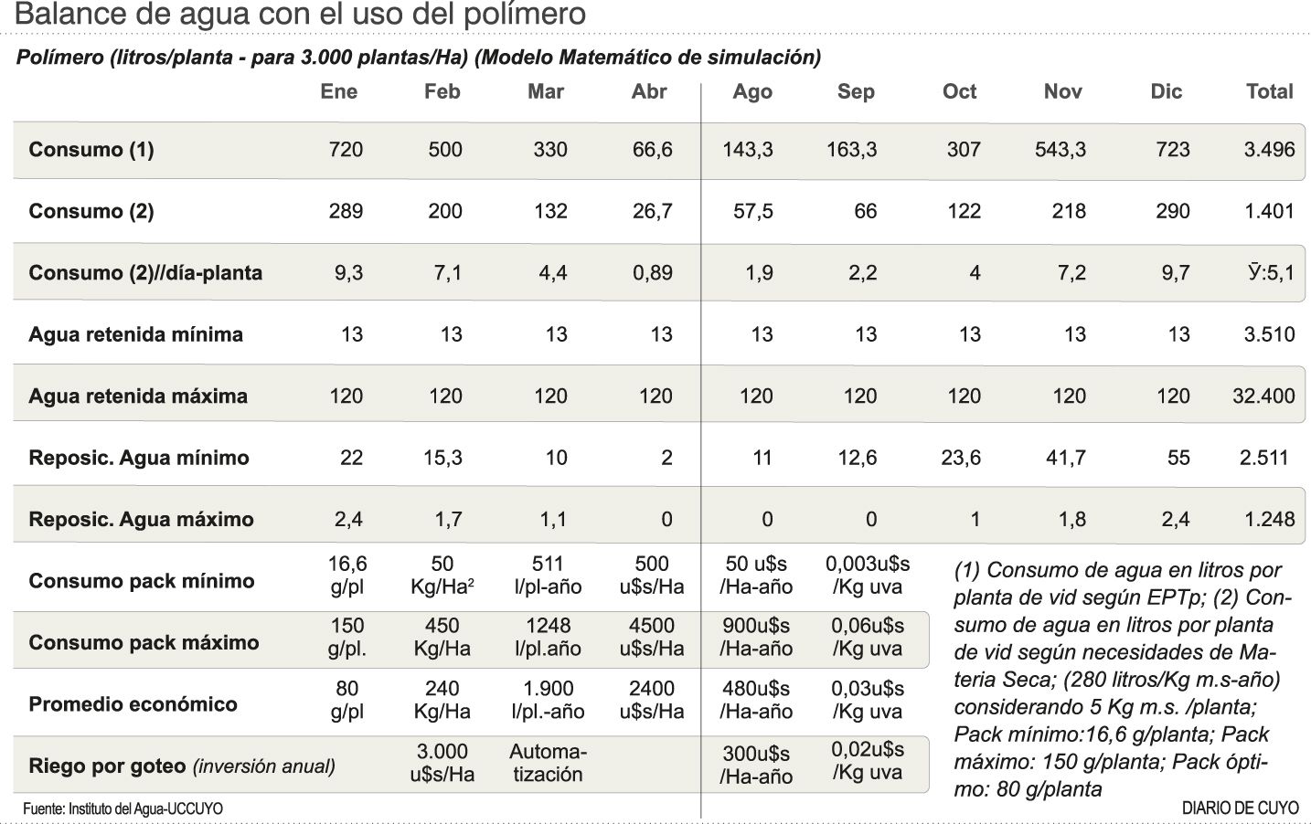 Según la prueba, mientras una planta de un viñedo consume 3.496 litros de agua por año, según una evaluación económica del uso del material, harían falta sólo 1.900 litros de agua por año, es decir el 54%. Para eso harían falta colocar 80 gramos por planta, equivalente a 240 kg/ha. Los costos para la condición promedio estimada serían de 2.400 U$S/ha, equivalente a 480 U$S/ha-año y 0,03 U$S/kg de uva.